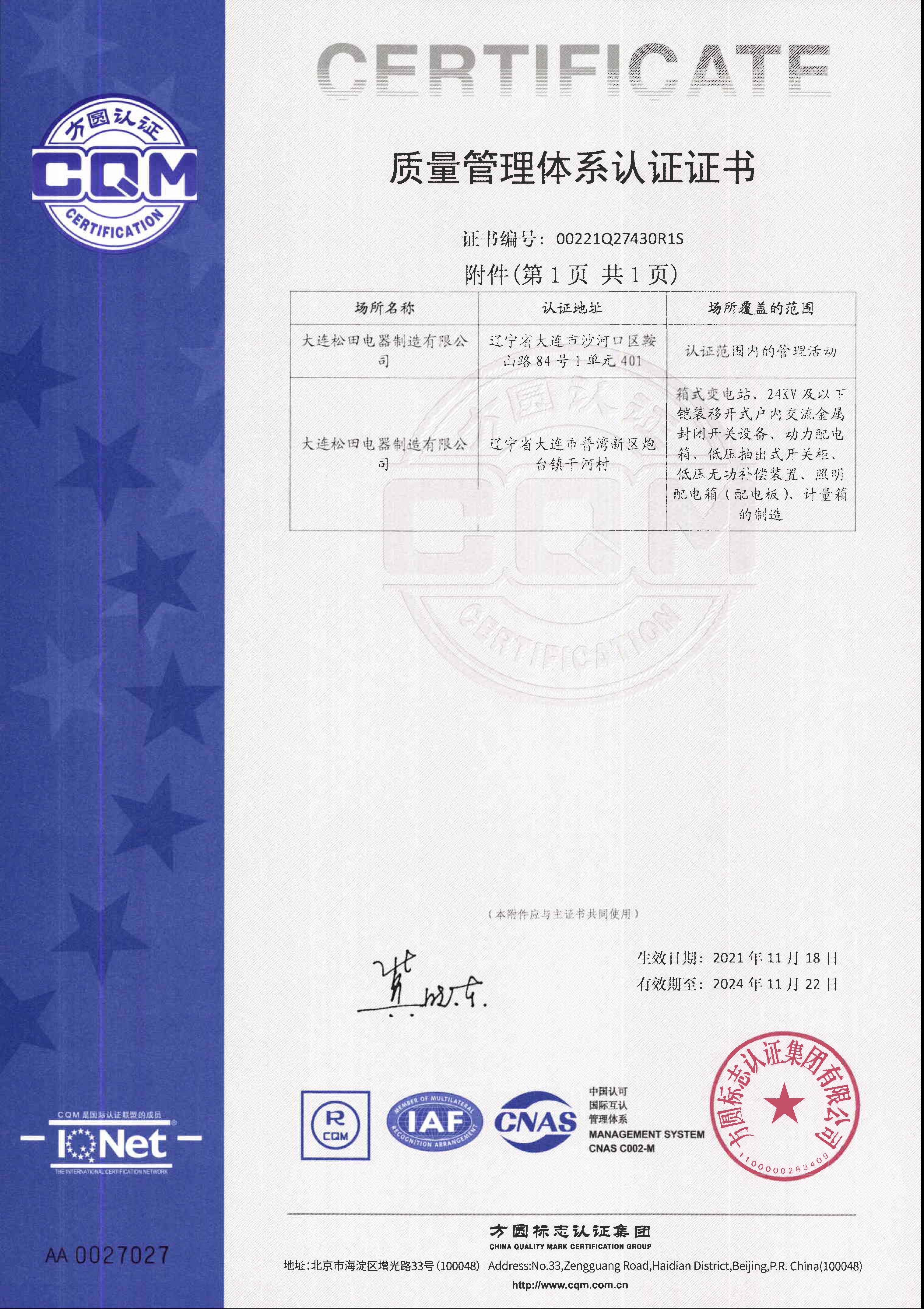 质量管理体系证书